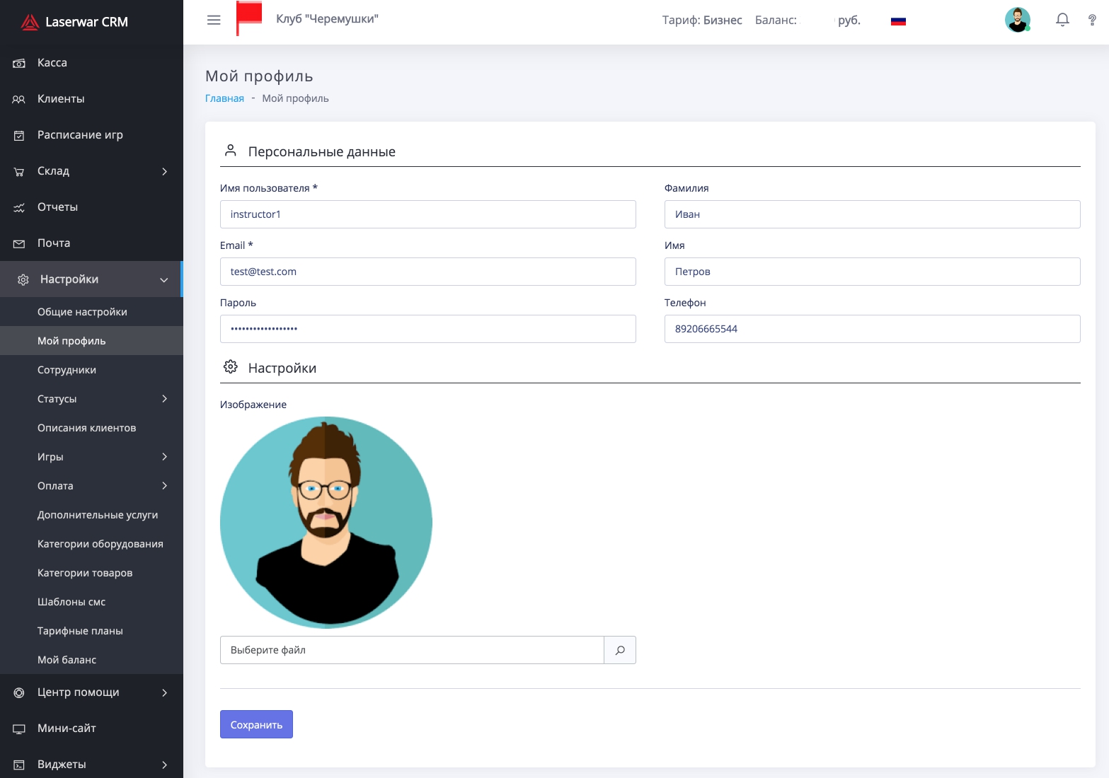 В подразделе "Мой профиль" редактируются персональные данные активного пользователя Laserwar CRM.